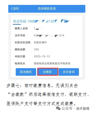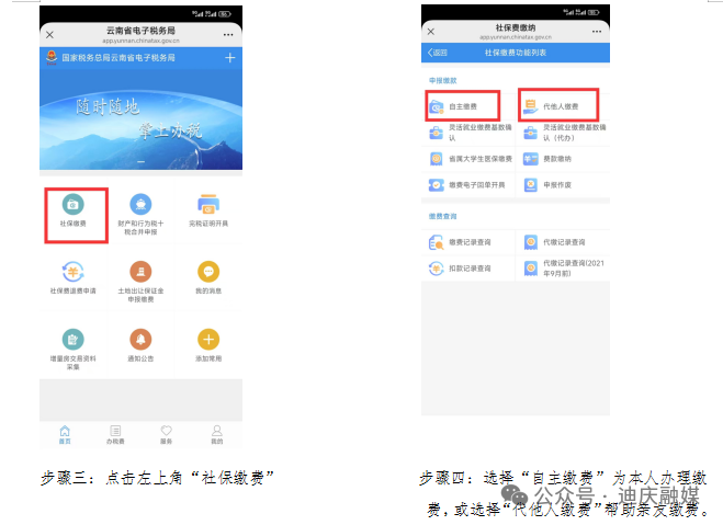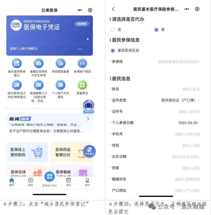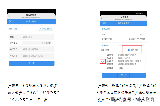 (一)城乡居民基本医保筹资标准: 2026年度城乡居民基本医疗保险筹资标准为每人每年1100元,其中财政补助每人每年700元,迪庆居民参保再补助70元,个人仅缴330元。 (二)城乡居民基本医保缴费时间: 1.集中征缴期 2025年10月10日至2026年2月25日。 2.非集中征缴期 (1)2026年3月1日至2026年6月25日,个人缴费每人每年330元,财政补助每人每年700元,医疗救助资助70元; (2)2026年7月1日至2026年12月25日,居民医保筹资(除医疗救助资助70元外)均由个人承担,个人缴费每人每年1030元。 温馨提示 1.未缴纳2025年度居民医保费用的参保人,即使在2026年集中缴费期内缴纳居民医保费用的,也将产生3个月固定待遇等待期,固定待遇等待期内参保人员不得享受城乡居民基本医疗保险、大病保险、居民生育保险等医保待遇,所以为保证待遇享受的连续性务必在年底前缴清2025年医保费用。 2.如果在2026年度非集中缴费期缴纳居民医保费的,从缴费到账之日起3个月内为医保待遇等待期,期间产生费用不能报销。 特殊人群资助参保政策 我州按4档19类人员给予资助参保,详见下表: 温馨提示 新生儿、动态新增的医疗救助对象、退役军人、随军未就业家属、刑满释放人员等群体,1年内实行随参随缴,只缴纳个人缴费部分,不设待遇等待期。 参保缴费方式 居民医疗参保缴费提供多种选择 ↓↓↓ 1.线上自主缴费 线上可通过“云南省电子税务局”微信小程序、支付宝小程序、一部手机办事通App或农信社手机银行App等渠道办理。 以“云南省电子税务局”缴费流程为例: 2.线下缴费 可到各县(市)政务服务中心办税服务大厅、农信社营业网点缴费。 参保登记流程 注意!!! 首次参保的人员 需要先办理参保登记 再进行参保缴费 操作步骤如下 1.线上自主参保 线上可通过支付宝或微信“云南医保”微信小程序,“一部手机办事通”App完成参保登记。 以微信“云南医保”小程序办理流程为例: 2.线下参保 可到各县(市)医保局、各乡镇(街道)医保经办机构,村(社区)下沉办服务站点、两定机构和金融机构延伸办服务网点办理参保登记。 其他事宜 为确保广大城乡居民基本户医疗保险缴费个人及时享受到2026年医疗保险待遇,请在集中征缴时间内完成缴费。 如果您在缴费过程中发现个人缴费信息错误请及时与各县(市)医保局联系: 州本级:0887—8388001 香格里拉市:0887—8229902 维西县:0887—8628719 德饮县:0887—8413839 |