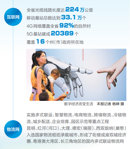 ——在国家特殊政策的关心支持下,云南优先实施2.5万公里“直过民族”、人口较少民族及沿边地区20户以上自然村通硬化路项目。 ——以昆明机场为枢纽的国内航线网络已然成形,省内旅游热点城市间环飞航线全覆盖、常态化、天天班的目标已基本实现,小机型、小航线、小航程的七彩通航民生航空网雏形初现。 ——各族群众高铁梦想变成现实,朝辞彩云南,夕至大上海,高铁千里一线牵,昆明至北上广等一线城市实现了当日到达。 “十三五”期间,全省铁路运营里程新增1573公里,达到4233公里。公路总里程达29.2万公里,其中高速公路新增5000公里,达到9006公里,总里程跃居全国第二。 一条条道路穿江达海,一个个项目陆续建成,不断织密的基础设施网络,打通了云南高质量跨越式发展的“任督二脉”。