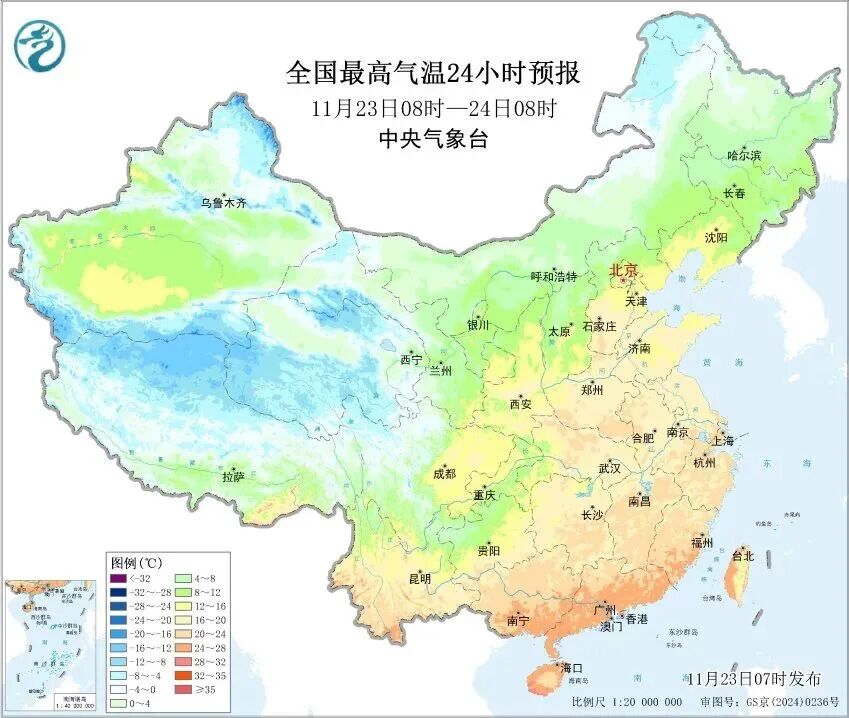 11月23日20时到11月24日20时:迪庆州、昭通市南部、曲靖市北部高海拔地区阴有小雪或雨夹雪,昭通市南部、曲靖市、昆明市、文山州西部、红河州东部、玉溪市东部、楚雄州、丽江市、大理州北部、迪庆州、怒江州北部多云转阴局部有小雨、中雨,其他地区晴间多云。