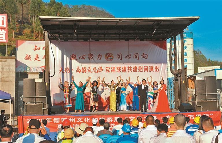 隧道深处,机器轰鸣;舞台之上,歌舞飞扬。10月27日下午,在大瑞铁路控制性工程——高黎贡山隧道旁的工地上,一场以“凝心聚力 同心同向”为主题的党建联建慰问演出隆重举行。州交通运输局、州文化和旅游局与中铁隧道局集团大瑞铁路项目经理部携手,将党的温暖与文化的力量,送到奋战在“钢铁丝路脊梁”上的建设者身边。