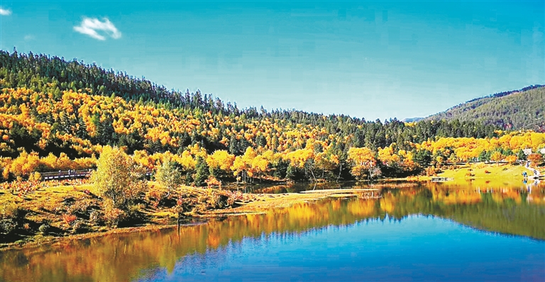 秋日的信笺被风揉碎,洒满了普达措。碧蓝如洗的属都湖,是大地沉静的眼眸,倒映着天际流云与漫山绚烂。山林仿佛打翻了调色盘,鎏金、赭红、墨绿交织碰撞,每一帧都如油画般浓烈而深邃。行走其间,恍若步入一个关于秋天的童话,能听见树叶飘落的密语与湖面微澜的呼吸。